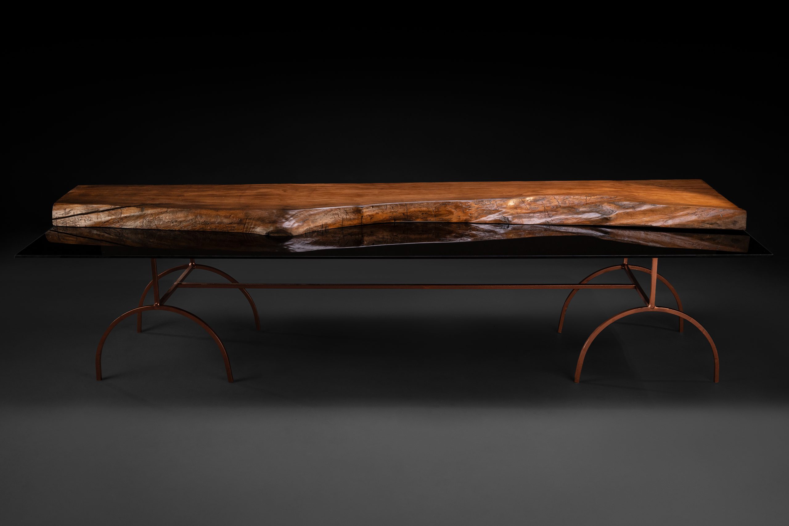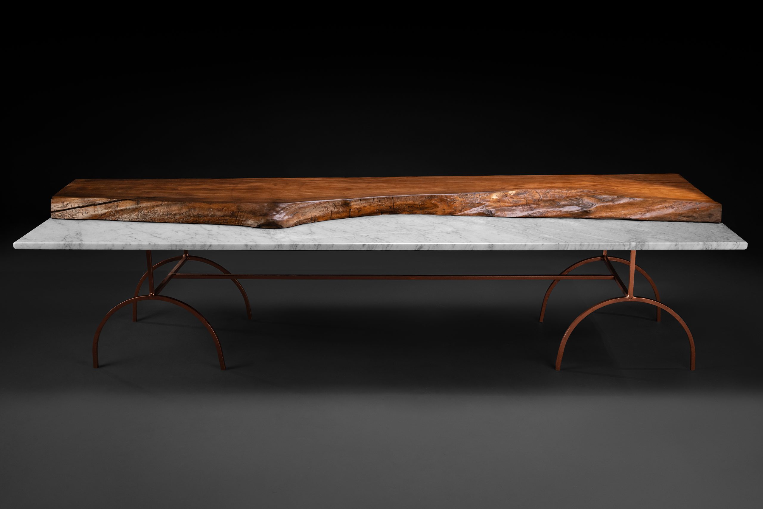 Un piede antico, forgiato a mano in ferro battuto e vestito di rame, sorregge l’incontro tra due mondi: il legno grezzo, vivo e imperfetto, e il marmo o vetro liscio e silenzioso.