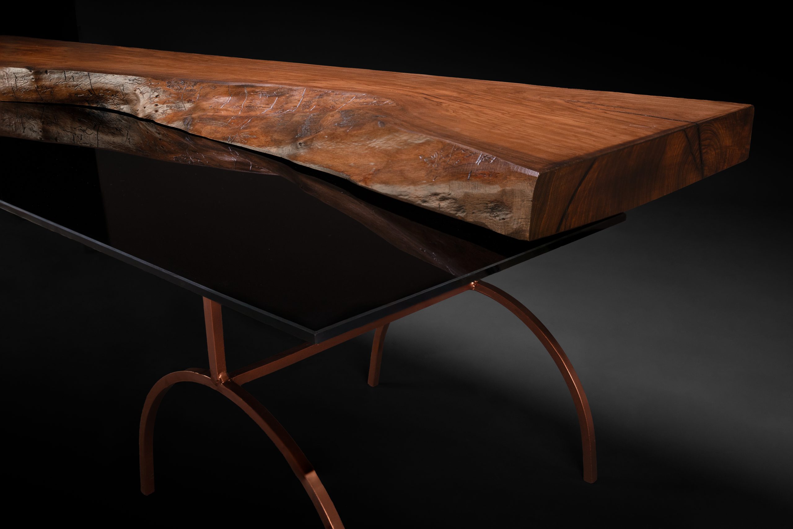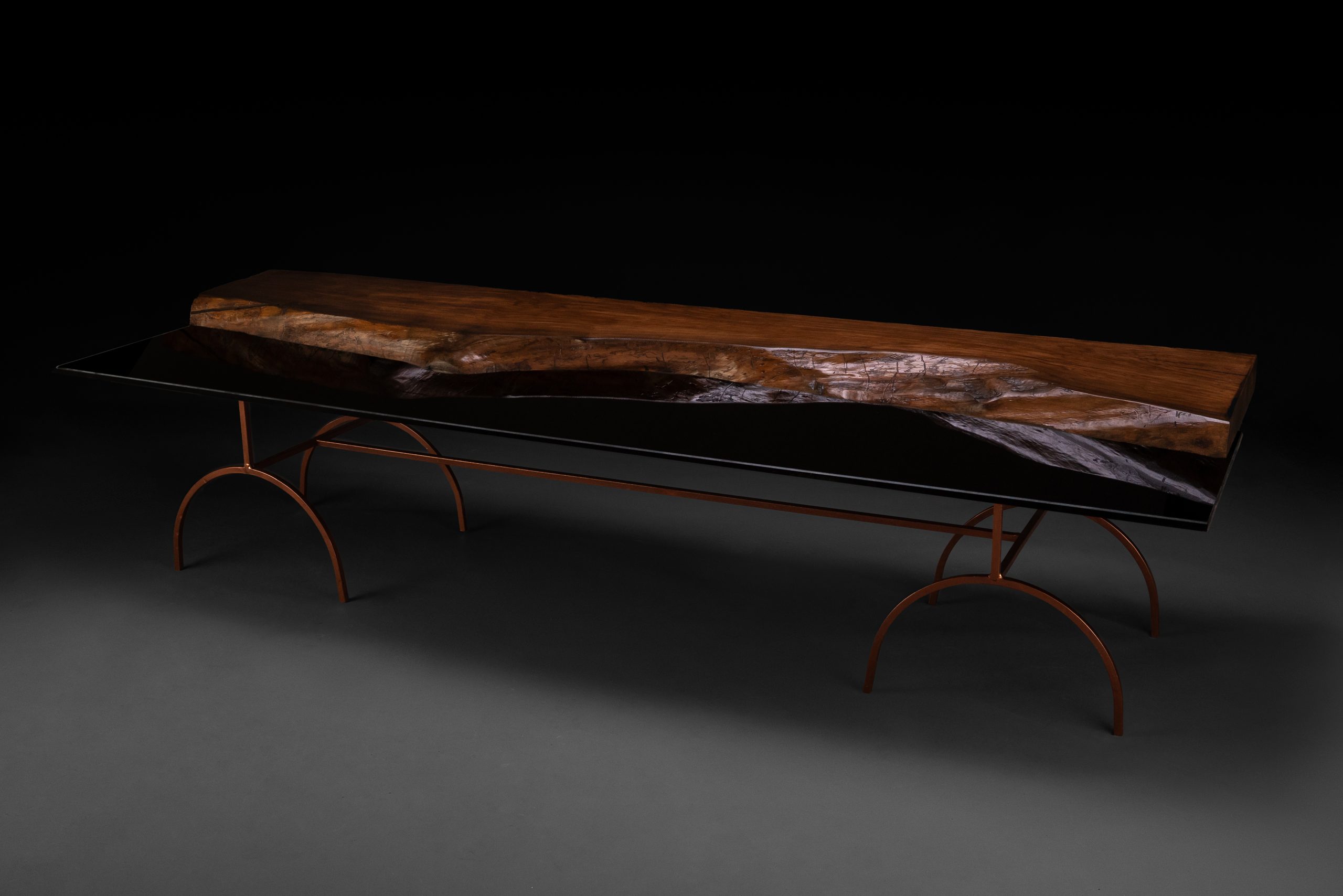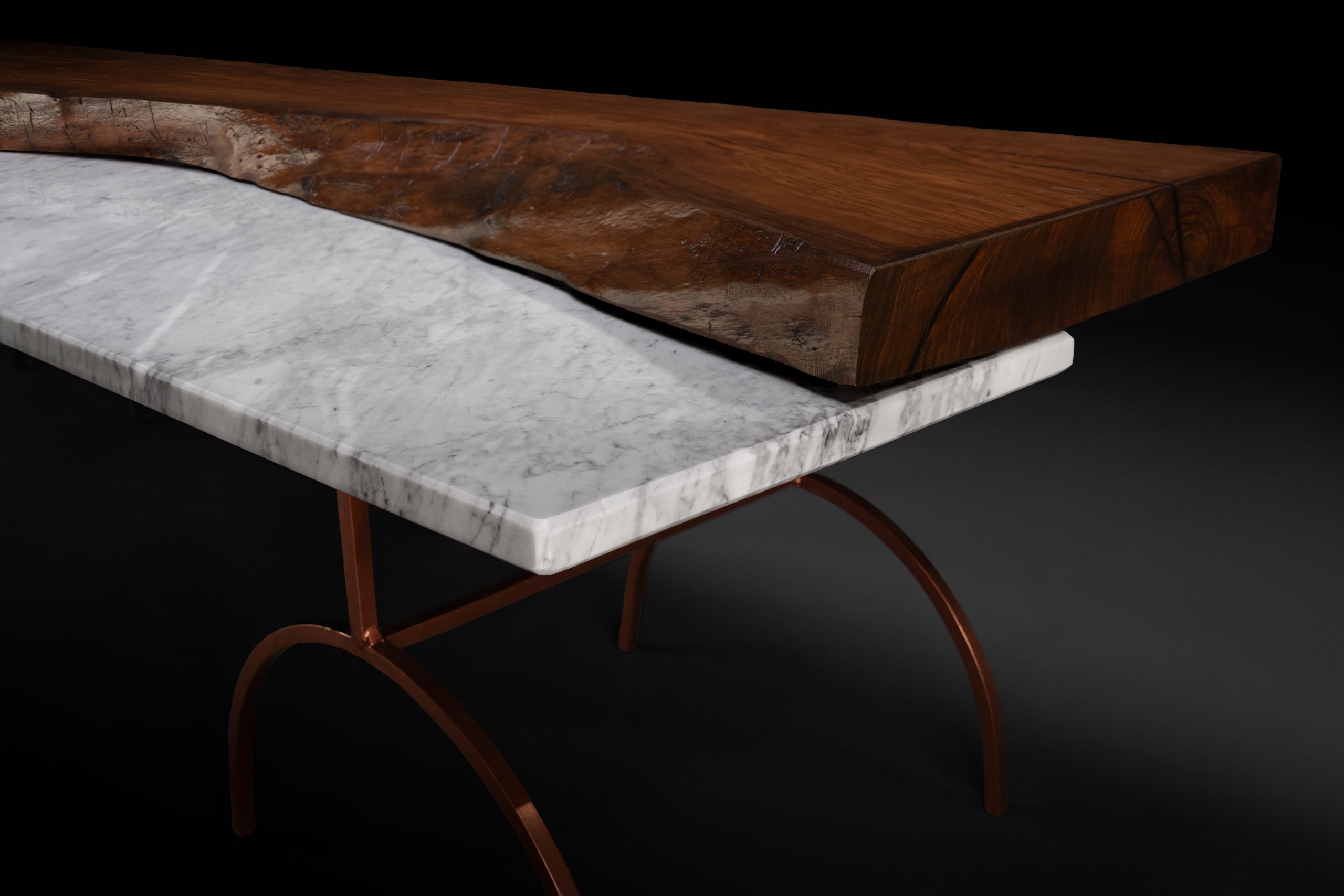 Un piede antico, forgiato a mano in ferro battuto e vestito di rame, sorregge l’incontro tra due mondi: il legno grezzo, vivo e imperfetto, e il marmo o vetro liscio e silenzioso.